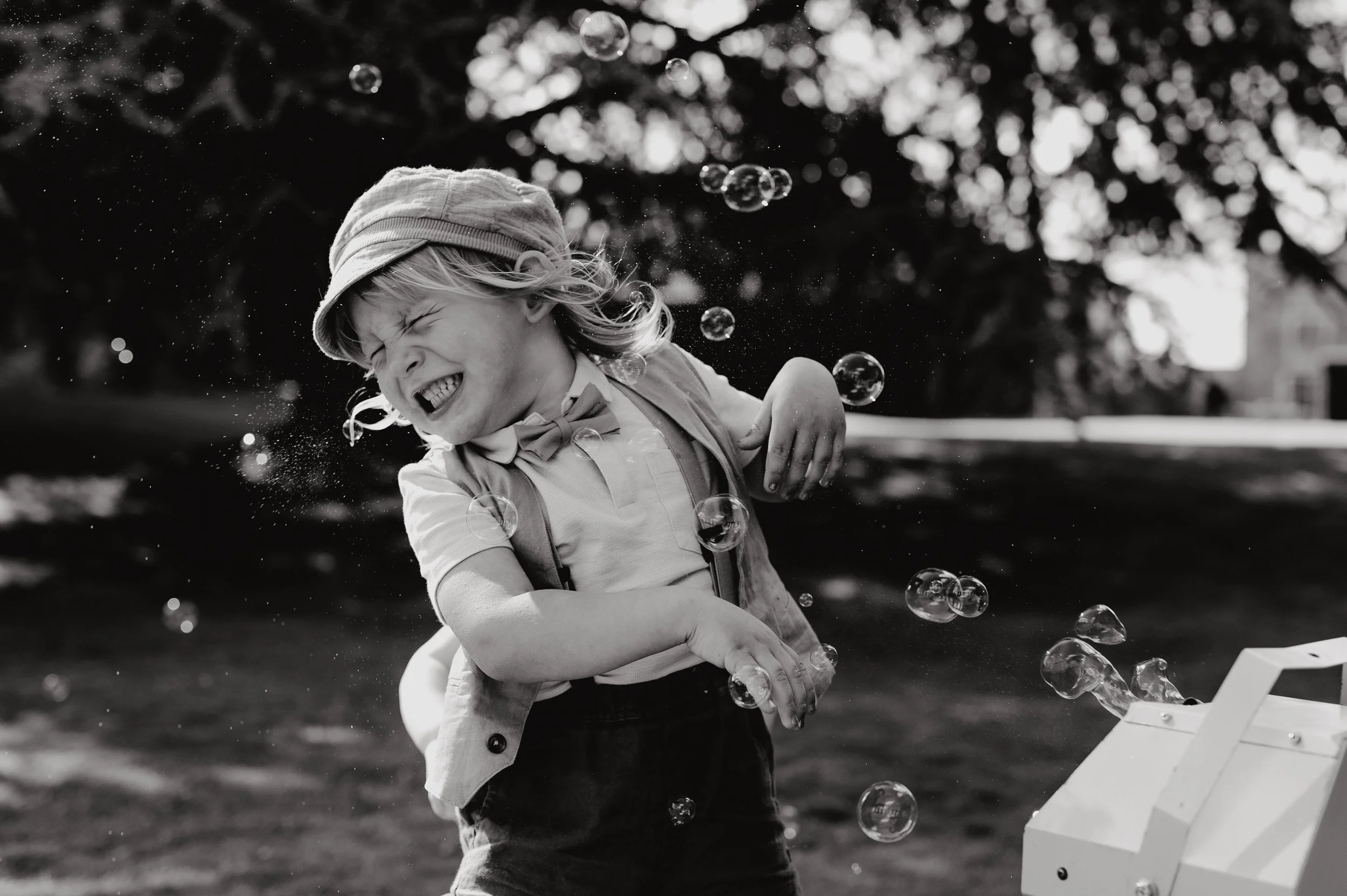 A candid moment of a child playing in bubbles captured by Dorset Wedding Photographers pip&clo